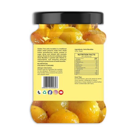A 500g jar of Amla Murabba typically contains Amla (Indian Gooseberry) pieces, sugar syrup, and sometimes additional ingredients like cardamom, black